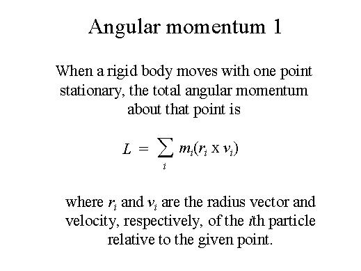 body moves with one point stationary, the total angular momentum about that point is the following, where ri and vi are the radius vector and velocity, respectively, of the ith particle relative to the given point. Since ri is a fixed vector relative to the body, the velocity vi with respect to the space set of axes solely from the rotational motion of the rigid body about the fixed point. |