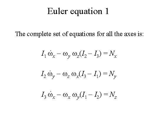 | The identification of some one of the principal axes as the z-axis is entirely arbitrary. Clearly we can permute the indices and write an equation similar to Lagrangian equation 1 for the component of the total torque along any of the other principal axes. Without further ado, the complete set of equations for all the axes is indicated here. These are the so-called Euler equations of motion for a rigid body with one point fixed. |