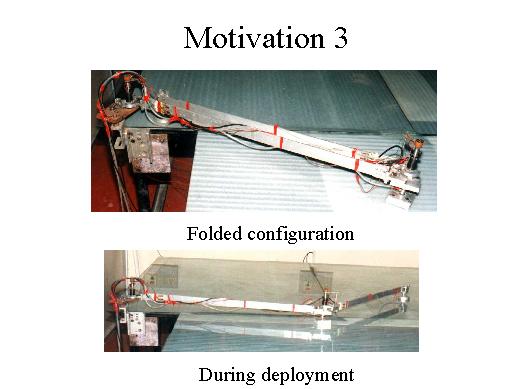 | We have also done some experiments to see the flexibility effects. This was one such experiment where we have a link, an aluminium link, which is very light-weight and flexible. It is initially in a folded configuration and then this link has several sensors. We can measure the rotation of each link and then we can also measure the vibration levels by means of a strain gauge. And then when we deploy this link, this is floating on some sort of a flat table. This is an intermediate configuration. |