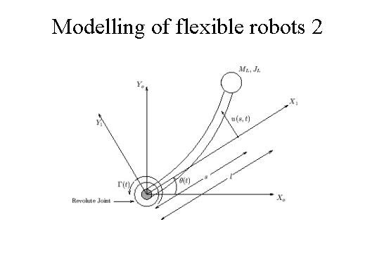 | One typical link is shown in this figure where we have a link which is carrying some weight at the end and the other end of the link is attached to a motor. This is a model of a revolute joint. So, in this figure I have shown that the line along the x-axis is the undeformed position of this link. It is rotated by an angle theta. But on top of this rigid rotation of the link we have some flexible displacement u(s,t). This link can bend about this rigid configuration. |