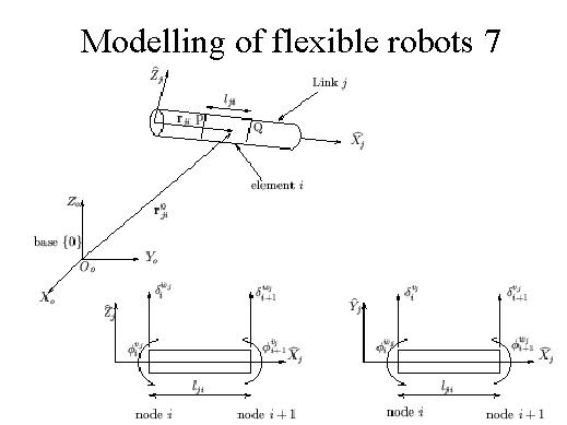 We know how to find the rigid portion of the transformation. One is what is called as a finite element model for the flexibility in which basically we assume that each link or member can be divided into small number of finite elements and at each finite element we have a nodal displacement, a nodal displacement of this form and a nodal rotation, a nodal displacement and another nodal rotation. We can find out by using traditional methods of finite element what these displacements and rotations correspond to. I will skip those. |