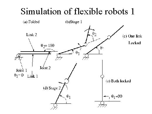 lock and we had some experimental data. So, let's try to see whether we can reproduce that experimental data using this modelling technique. To recapitulate what we had is two links, one link like this, another link like this. They are initially in a folded configuration like this. And then they start moving in opposite directions. After some time the second joint locks and then this whole system starts moving as a single link flexible manipulator. It continues to move and eventually this joint will also lock and this thing will behave as a cantilever with one end fixed. We would like to predict the motion of all these different stages and in addition we would like to obtain the values of the strains as a function of time. And the vibrations as a function of time and compare with experiments. |