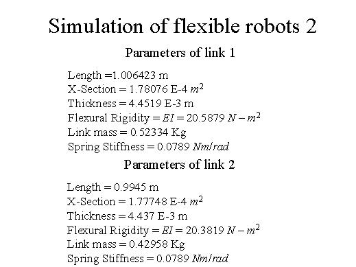 | So, very quickly, what are the parameters which were used for the experiments? These are the same parameters of the experimental set-up. So, we have link lengths which is roughly of the order of a meter. Cross-section about 1.7 into E-4 m2 and so on. And similarly for the second link it is about little less than a meter. Thickness is this. Mass is about little less than half a kg. These are the parameters which were determined from the actual experimental set-up. |