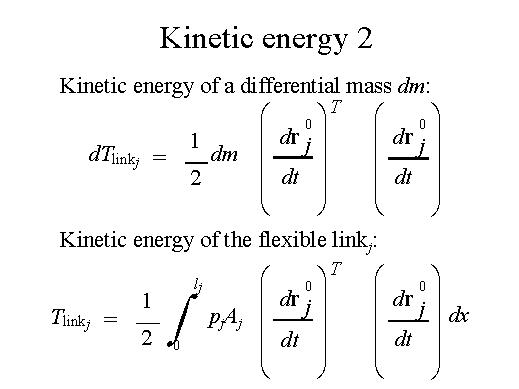 | Under the assumption that the links are slender beams, the kinetic energy of the flexible link j can be obtained by integrating over the length (lj) of the link as follows, where pj is the density of the material, and Aj is the cross-sectional area of the link.. |