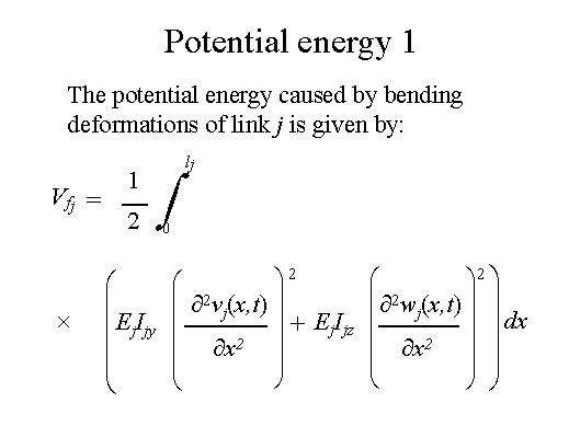 | The potential energy of the flexible manipulator system arises from two sources: the deformation of the links and gravity. Assuming slender beam type links and neglecting the axial and torsional vibration of links, the potential energy caused by bending deformation of link j about the transverse axes is given here, where Ej is the Young's modulus, and Ijy, Ijz are the area moments of inertia about the respective axes of link j. |