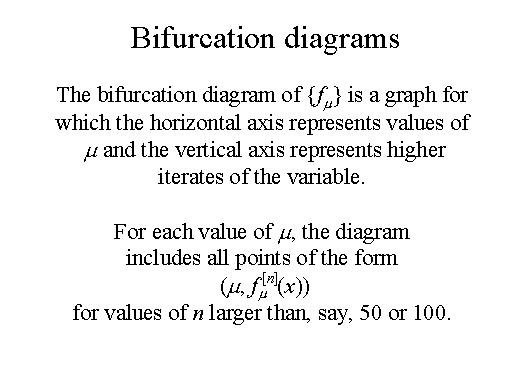 | One method of displaying the points at which a parametrized family of functions {fm} bifurcates is called a bifurcation diagram, and is designated to give information about the behaviour of higher iterates of arbitrary members of the domain of fm for all values of the parameter m. |