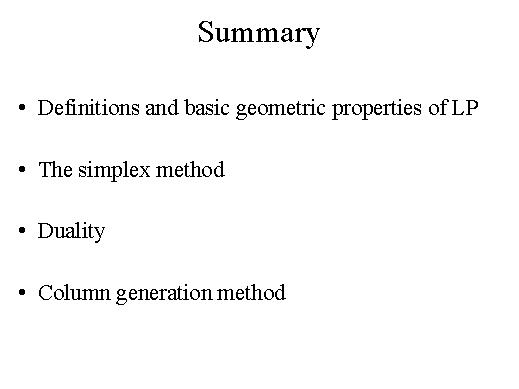 This first lecture will be devoted to review the main properties, results and methods concerning Linear Programming, one fundamental topic of Optimization. After having gone over the definition and the fundamental geometric properties of linear programming, we are going to overview the simplex method, which is the most well known procedure for solving it. Then the concept of dual problem will be introduced together with the main duality results valid for linear programming. Finally we are going to look at how, in particular cases, even linear programming problems with a huge number of variables can be solved with the simplex method through the so called column generation approach. |