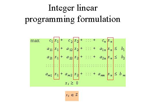 This lecture is about integer linear programming. In the previous lecture we saw how to solve problems where variables are constrained by inequalities and non-negativity constraints. Here we constrain the variables to be integer, and this makes a lot of difference in the problem. |
