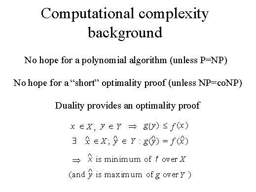 So, what we know is that there is no hope for a polynomial algorithm for integer linear programming unless of course NP is equal to P. And at the same time there is no hope for a short optimality proof. For example, an optimality proof is provided by duality. In this case we have two sets and two functions. We know that each one is upper bounded by the other one and we know there exist two points, hat x and hat y, such that the inequality turns into an equality. So, the implication is that hat x is a minimum of f(x) and a the same time hat y is a maximum of g(y). If we are able to find things of this sort, then once we have a solution we are able to prove its optimality. |