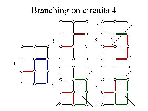 So let's try with set 1 by producing this circuit here. We do the same strategy. We put one arc here and make the arc out and in. Then we have all four possibilities, this arc in, this out, this in, this out and the fourth possibility. So, again we name this sets 5, 6, 7 and 8. Immediately we realise that 6, 7, and 8 don't have any possibilities of Hamiltonian circuits. So we are forced to work out number 5. |