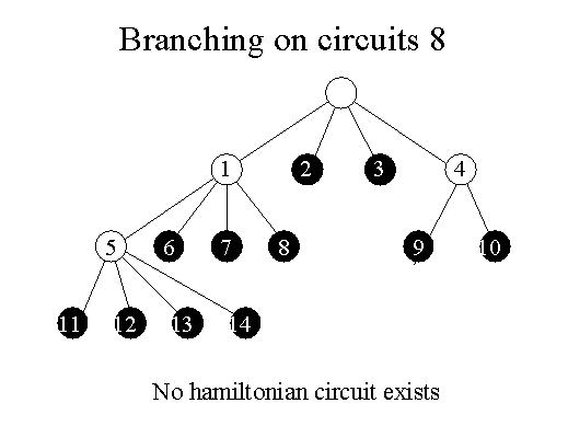 So the conclusion: this is the search tree and we have proven that for that graph there exist no Hamiltonian circuit. The same branching is used in some more fancy way for the travelling salesman problem.
