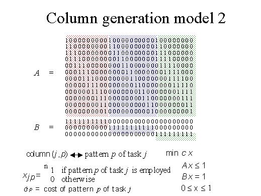 So if we consider all possible starting times for each job we end up with this big matrix where we have divided the columns referring to each job. The red columns refer to the red job and each column is a possible schedule. The blue is the second job and each column is a possible schedule. So the first job lasts three units of time, and these are its three corresponding ones. The second lasts two units of time and the third one four units of time. We call the column jp the pattern p of job j. Then we introduce a variable xjp with value 1 if the pattern p of task j is employed, 0 otherwise. Then we have to impose that at least one pattern be taken because the job must be processed. So, we need another matrix which takes care of this assignment constraint. Let's call the first matrix A, the second one B, then the constraints say that Ax is less or equal to 1, so that there is no overlapping in time of the jobs and Bx is equal to 1 meaning that each job is processed at a certain time. The variables must be 0,1. Then if we attach a cost to each pattern we may minimise the cost over all possible patterns. However, the problem here is integral and we relax it as before. |