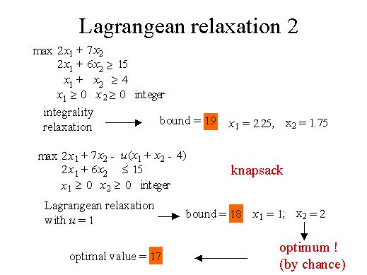 For instance, suppose we have this little problem with two constraints. The integrality relaxation provides a bound of 19. If we use the Lagrangean relaxation we drop one constraint and put it in the objection function. This turns out to be a knapsack problem which we know how to solve. The Lagrangean relaxation with u=1 provides a bound of 18. Its integral solution has value 17, which is by chance in this case just the optimum. If we compare the optimum value of the problem which is 17 with the two bounds, the Lagrangean bound and the integrality relaxation bound we see that the Lagrangean bound in this case is better. So in some cases the Lagrangean relaxation can provide better lower bounds. |