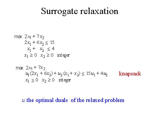 Another relaxation is the following one: take again the same problem and u are the optimal dual of the relaxed problem. What we do here is transform all of the constraints into one constraint where the multipliers are the optimal duels of the relaxed problem. This is called surrogate relaxation. And again this is a knapsack problem. In some cases this relaxation is better than the Lagrangean relaxation. |