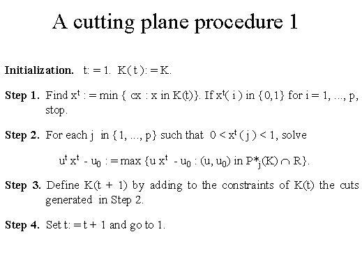 for the mixed 0-1 problem. We start from the relaxation of the problem and solve it. If the optimal solution has all the first p components integer, then it is an optimal solution of the mixed integer problem and the methods stop. Otherwise one can consider all the components among the first p ones that are fractional in the current solution, find an equal number of cutting planes by solving the separation problem with respect to the corresponding polyhedra Pj(K) and add the found inequalities to the current formulation. Finally we solve the problem on the augmented set of constraints and move to the next iteration. |