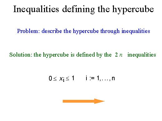 Then we want to solve the following problem: how to describe the hypercube through inequalities, and not just as a convex hull of points? The solution is easy in this case. The hypercube is defined by the following 2n inequalities. The striking result is that we have an exponential number of vertices and we are able to describe this set by simply 2n inequalities. A very simple, compact description of the hypercube. |
