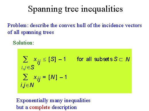 Well, the solution is the following one: in this case we have an inequality for each subset of N. We know that this is an exponential number of subsets: 2 to the n minus 2 in this case; we don't consider the empty set and the full set. And for the full set, we have this equality which amounts to saying that we want to have n-1 arcs in the spanning tree. As for the others they express the fact that there must be no cycles. Question. These are certainly valid inequalities for spanning trees, but are they also enough to describe completely the convex hull? This question can be answered in affirmative terms: it is a complete description, although it has exponentially many inequalities. But I stress the fact that this is a complete description. And so this is a nice result. Indeed, this happens for a problem which is not NP-complete. We know that there exist polynomial algorithms for the minimal spanning tree problem. |