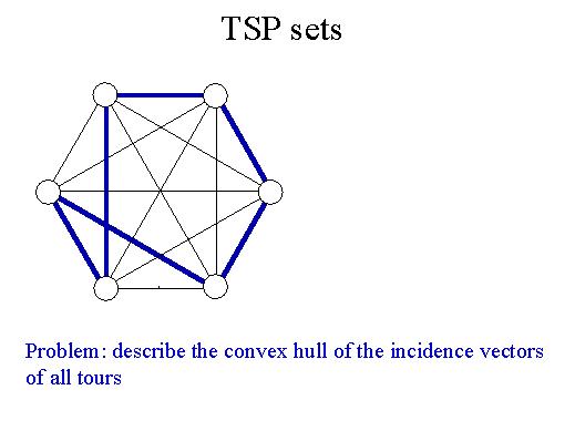 So let's now go to difficult problems. We consider the travelling salesman problem. This a prototype of an NP-complete problem. So what is the problem here? We want to describe the convex hull of all tours in a complete graph. This is one tour for instance. |