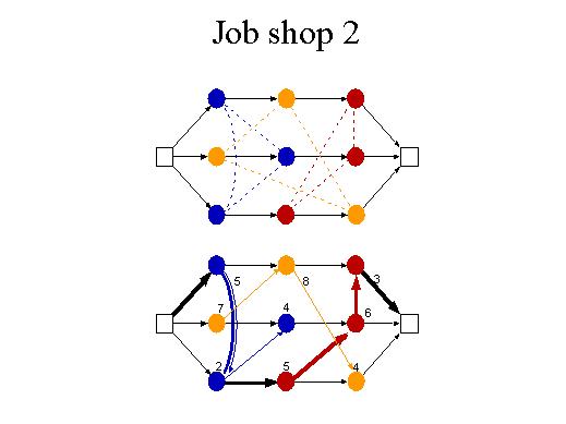 A possible combinatorial description of the problem is given by this graph where each chain corresponds to a job. Each operation is associated to a node of the graph and the arcs define technological precedences for the operations of each job. The node colours refer to the machines, so that the operations with the same colour have to be processed by the same machine. Moreover, since operations on the same machine cannot be processed at the same time, we have to insert precedences between operations associated to the same machine. We have many ways to do this, too many actually, and this is the very problem. In the first picture the dotted arcs represent precedences whose orientations have to be decided. In the second picture a possible choice is shown. The processing times translate into arc lengths and finding the minimum completion time amounts to finding the longest path in the graph, also called the critical path. With the indicated values of the processing times the heavy arcs represent the longest path. |