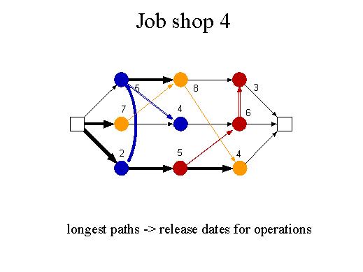 A simple heuristic to solve the problem consists in exchanging some precedence order on the critical path and repeating this operation until no improvement can be obtained. A more powerful heuristic can be designed by assigning in turn operation sequences to each machine. In order to assign a particular sequence to the operations on a certain machine we first disregard previously assigned precedences for that machine, then we realise that the longest paths from the source node to each one of these operations correspond to the time which has to elapse before the starting time of the operation. So, they are like release dates for the operations. |