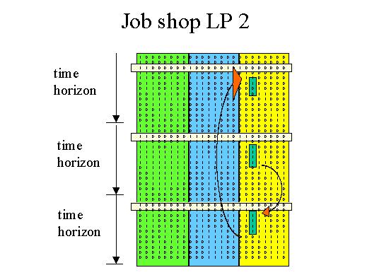 We may build a very big matrix where we have the time horizon for the first machine, the second machine and for the third machine. And this is for the blue machine, the yellow machine and the red machine. The ones in the upper-left part of the matrix are possible schedules of the first job on the first machine. The ones in the upper-central part of the matrix are possible schedules of the second job on the first machine and the ones in the upper-right part of the matrix are possible schedules of the third job on the first machine. The same can be said for the time horizon related to the second machine and for the third machine. Since each row is a particular time and each machine can process at most one operation at a time, we can choose columns, i.e. schedules, with at most one 1 in each row. |