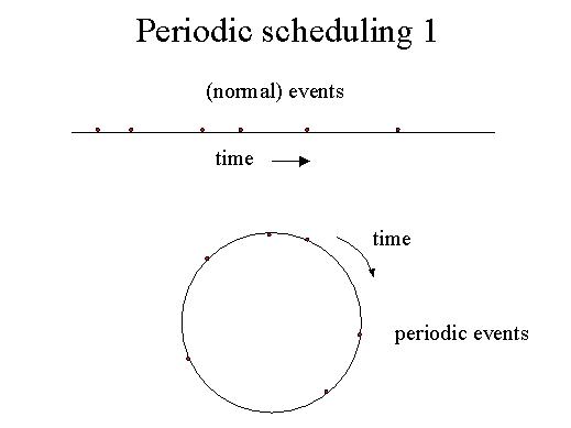 So let's go to another problem. We consider the periodic scheduling problem. Let's first try a combinatorial approach. In normal scheduling time is the real line going from minus infinity to plus infinity. And normal events are just points on this line. But in periodic scheduling time is circular. And events occur on this circular model of time. We call these periodic events. |