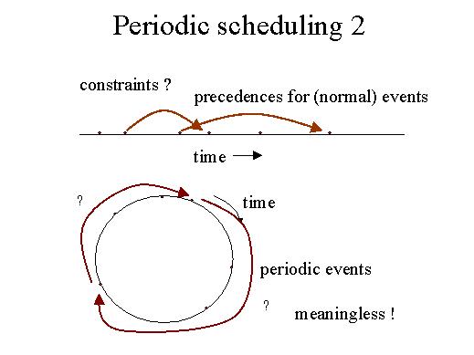 What about constraints for this problem? In case of the real time we may say that given two events we may define precedences for normal events in this way: one after the other. But if we consider periodic scheduling precedences are meaningless because we may say that event A is after B but at the same time we may say that event B is after A. So what kind of precedence constraints should we consider? |