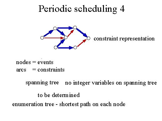We may represent these constraints by saying that these nodes are periodic events to be scheduled and the arcs are constraints for particular pairs of events. A possible way to solve it is by first finding a spanning tree for these arcs and then determining integral variables for the chords of the spanning tree. The enumeration tree has the purpose of determining the integer values and the nice thing is that in each node of the enumeration tree what we have to find out is a shortest path. Otherwise we may resort to the previous formulation which was after all linear programming and we may choose either model to resolve the problem. |