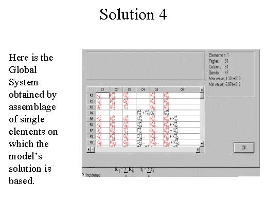 | Here is the Global System obtained by assemblage of single elements on which the model's solution is based. As for the Local System, one can select the Global Stiffness Matrix (K) or the Known Load Vector (f). In the window there are the terms that compose the global matrices. If the option 'Incidence' is active, you can see all the contributes with assemblage's references selects. |