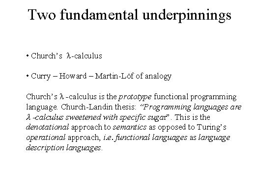 | Functional programming and typed-functional programming in particular have two fundamental logical underpinnings. The first is Church's l calculus and the second is, what we may call, Curry - Howard - Martin-Löf analogy. Church's l calculus is the prototype functional programming language. It was invented in the early forties by the American logician Alonso Church. The interest of l calculus lies essentially in what we may phrase as the Church-Landin's thesis, which says the following: programming languages are l calculus sweetened with specific sugar. This is a concise way of describing the so-called denotational approach to semantics as opposed to Turing's approach which was more operational given in terms of Turing machines. So we can summarise this by saying that functional languages are extremely useful especially because they are language description languages. |
