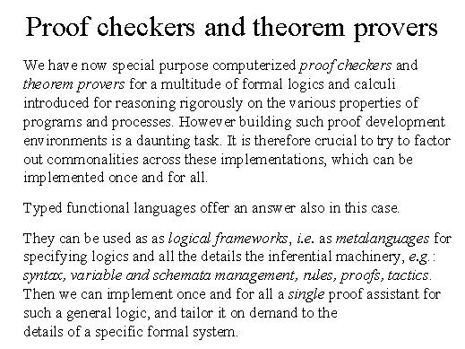 | We have nowadays a multitude, even a plethora, of different proof checkers and theorem provers. For the multitude of calculi and formal systems that have been developed by the theoretical computer science community for reasoning rigorously on the various properties of programs and processes. But building any of such formal computer systems is a very daunting task. And in fact one has to, building it from scratch I mean, and so it is crucial if we want to use various formal systems. It is often the case also that when you want to prove some property of your system, one particular logical system is not enough and you have to switch and perhaps prove as lemma using a different logical system from the one you are actually going to use for the proof of the final specification. So you actually need more than one implementation of your logical system. So is it possible to factor out commonalties across implementations of various formal systems so that we can implement them once and for all? Again type-functional language do offer an answer. And the answer is as I had anticipated logical frameworks. That is you can view typed functional languages as metalanguages for specifying logics and all the details of the inferential machinery, such as syntax, variable and schemata managing, rules, proofs, tactics. Then we can implement once and for all a proof editor for our metalanguage and here we are done, we can on demand tailor such a general implementation to the implementation for a specific formal system. |