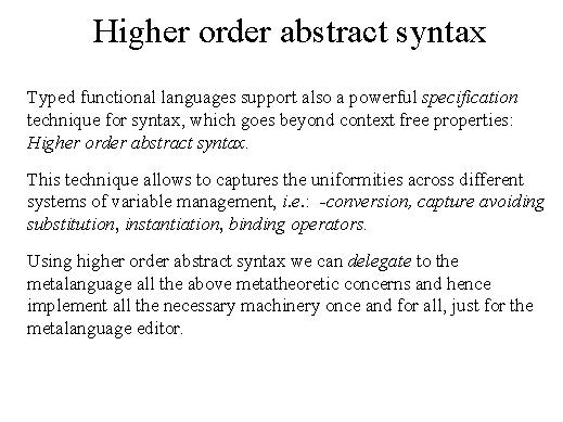 syntax". This technique allows in fact to capture across different formal systems all the details of variable management and these are alpha conversion, capture-avoiding substitution, instantiation, binding operations and so on. Using "higher order abstract syntax" we can delegate all these features to the metalanguage and thus having implemented and editor or a proof-assistant for the metalanguage once and for all we have solved all future problems having to do with the specification of the syntax for specific languages. |