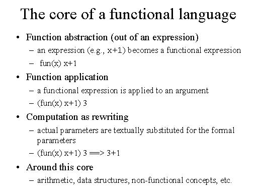 of functional programming languages like ML. The core of a functional language - or better, of any programming language - is the ability to build abstractions over expressions - or over control statements in imperative programming - and then the ability to use this abstractions by applying them to arguments. Hence, in functional programming languages we have the ability to build a function abstraction out of an expression; in this way we define a function, a function of a formal parameter x that will give us back a result. We may then apply this function to an argument. The computation of this kind of structure may be explained as the formal symbolic rewriting of the body of the function, after the actual parameter is substituted for the formal parameter. This textual substitution and this rewriting are not actually performed in real-life programming languages. But it is a very fruitful conceptual tool in order to explain many of the features and many of the issues that are connected with functional languages. In a real language we will have also arithmetic, data structures, maybe non-functional concepts, and so on. However, in this lecture we will deal only with the formal core. |