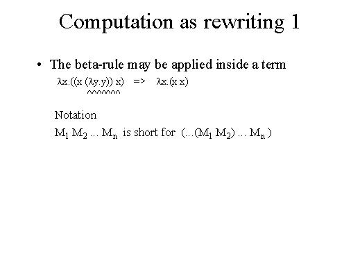 | Let's have a look a bit more in depth at this concept of computation as rewriting. First of all, the beta-rule. As we have shown in the previous slide, we call beta-rule this rewriting rule; we call redex a string that is an abstraction followed by another term. Now, a beta-rule may even be applied inside a term. So, whenever we find an application, a l something applied to an argument, then we may rewrite the term. We say that we may reduce, we may contract the redex. |