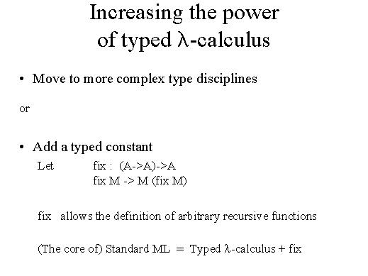 of arbitrary recursive functions. Therefore, from the typed l-calculus and fix we get again a typed calculus where all Turing computable functions are expressible. This, as I said, is the choice of Standard ML. But for other purposes, for the purpose of proof checking or for the purpose of having logical frameworks, it is quite handy to have more complex, more expressive typed disciplines. |