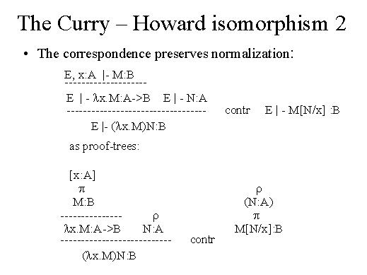 | An important property of this isomorphism is that it is preserved under normalisation. Suppose we have a derivation where a redex is introduced. We know by the beta-rule computation that this term reduces to another term, that is to M where N is substituted for x. Now, the contraction which makes sense at a computational level makes deep sense also at a logical level. It is simply what in natural deduction is called the normalisation of proofs, a notion studied by Prawitz in the '60s and which once again corresponds exactly to the beta-rule of functional languages. |