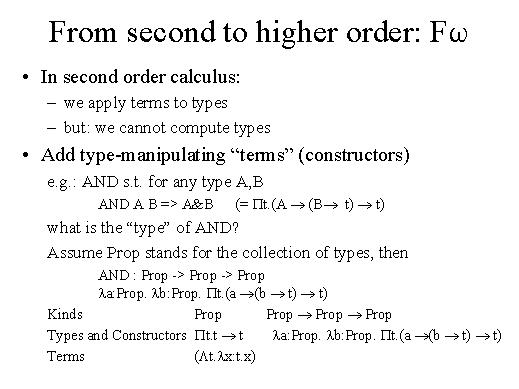 and give us back types. Now, what can be the type of a term like AND? If we assume that Prop stands for the collection of types, then AND takes a Prop, takes then another Prop - this capital A and this capital B in the slide - and gives back another type, another Prop - this type "A&B". Under these assumptions we have a stratification of layers. We have terms like our Lt lx:t.x. Then we have types for these terms, like the one in the slide. But at this level we also have constructors, that is terms like this one in the slide that manipulates types. And then, at the further level, we have what we may call the types of these terms manipulating types. We call "kinds" these new types. So, we have types here and the type of a type is a kind. We have one kind - Prop - and then we form other kinds by using this arrow constructor. |