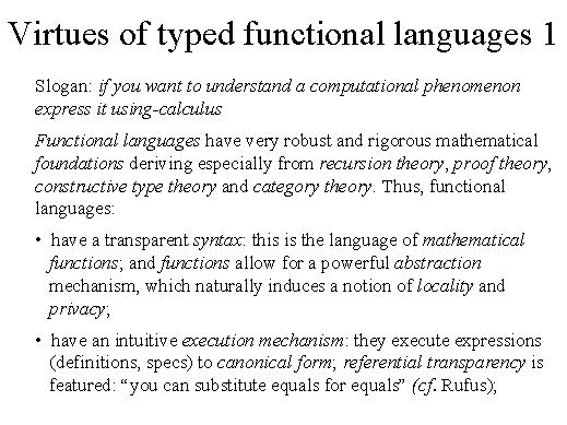 easier. The general slogan is the following: if you want to understand something, some computational phenomenon expressed using l calculus. Why is this so? l calculus, as we have seen, is the paradigm functional programming languages. And functional programming languages have a very robust and rigorous mathematical foundation deriving especially from geometry, proof theory, constructive-typed theory and category theory. Thus functional languages have a transparent syntax. This is the language of mathematical functions. And functions allow for a powerful abstraction mechanism which naturally induces a notion of locality and privacy. Functional languages also have a very intuitive execution mechanism. They execute expressions, definitions, specifications to canonical form. They also feature what is called the referential transparency, that is you can substitute equals for equals while preserving the meaning. Here the classical counter example would be the sentence: Rufus was called this way because of the colour of his beard. And of course, Rufus, which means red, cannot be replaced by King Frederick because the sentence clearly King Frederick was called this way because of the colour of his beard does not really make any sense. So, there are extensional properties, only extensional properties can be involved in referentially transparent languages. This is the case for functional languages. |