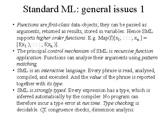 | Let's discuss briefly some general issues concerning Standard ML. First of all, functions are first-class data objects. They can be parsed as arguments, returned as results, stored in variables. Hence, SML supports higher order functions. Here is an example of a higher order function. The MAP function, as you can see, takes as input a function and a list and it produces the list obtained by applying this function to all the elements of the list. The principal control mechanism of SML is in fact a recursive function application. But there are no distracters. Functions can analyse their arguments using pattern matching. SML is an interactive language. Every phrase is read, analysed, compiled and executed. And the value of the phrase is reported together with its type. In fact, SML, as we have mentioned already, is strongly typed, that is every expression has a type, which is inferred automatically by the compiler. No problem can therefore incur a type error at one time. Type-checking is decidable and here I have listed two examples of different kinds of analysis which should suggest what the role of type-checking is as intended in type-functional languages. Look at congruence checks as are taught to children in preparatory classes or dimension analysis in physics. |