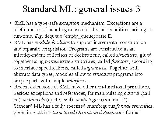 | SML also has a type-safe exception mechanism. What is an exception mechanism? Well, we all know that there are natural functions that are not defined over the whole domain, for instance the classical example is the DQ function over Qs. Clearly we have to define what the value of this function is also in the empty Q. And of course it makes no sense to give sort of a canonical value. It is better just to say raise an exception. SML has module facilities which support incremental construction and separate compilation. Recent extensions of SML also have other non-functional primitives besides exceptions and references. For manipulation control like call-CC, metalevels like quote-eval multistages. and finally Standard ML has a fully specified unambiguous form of semantics. |