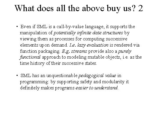 | Even if SML is a call-by-value language it supports the manipulation of potentially infinite data structures like streams by viewing them as processes for computing successive elements upon demand. The classical example here is, as I mentioned earlier, the notion of stream. Here lazy evaluation is rendered via function packaging. SML has an unquestionable, finally this is to conclude, has an unquestionable pedagogical value in programming since it supports safe and modularity, safety and modularity, it definitely makes programmes easier to understand. |