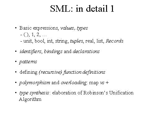 | Now let's go briefly through some more detailed aspects of functional language. Of course we have basic expressions, values and types. Here you can see them listed. What you do essentially in writing a programme, you build a declaration through a number of bindings of given identifiers. We will then discuss pattern matching. We will show how to give recursive function definitions. When we will discuss the typing discipline we will make sure that people understand the distinction between polymorphisms and overloading. In many languages we have operators which can apply to various types just think about plus which is defined in most programming languages with the same symbol whether we denote the plus over integer or over reals. But here it is not the same code that is used in evaluating that expression. This is just overloading. It is not the kind of polymorphism that we saw earlier when we discussed the function MAP. The type-synthesis algorithm of SML is essentially based on Robinson's unification algorithm. |