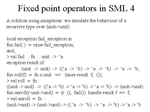 | Let me just show how to define a recursive function just by using exceptions. This is rather interesting because here we are not using in any sense any recursive programme. Here we are showing that in fact the non-functional feature of exceptions is powerful enough to be able to define non-terminating functions, to be able to define general recursion. What do we do? Well, essentially we simulate the recursive abstract data type that we had in the previous slide with this new type: unit arrow unit. Of course this is just a conventional type. All the action goes on precisely in the raising of an exception. This time we implement roll and unroll independently and as you see what does roll do? Well, it takes a function of this form and packages it not as a function of AB l as in the previous example but as an object of unit arrow unit. So where has the function F gone? Well, it has been raised as an exception. If unroll, as is the case here, is capable of capturing this exception and handling it, you see this is an exception with a parameter, and handling it by producing back, by returning back the original function, here we have implemented unroll. This time if we use roll and unroll as we did in the previous example here we will be again be able to type the fixed-point combinator Y and to use it safely as a fixed-point combinator for defining yet in another way the safe factorial function. The type of the functor of Y as you see will be still the same. All the action here is hidden in this roll and unroll. |