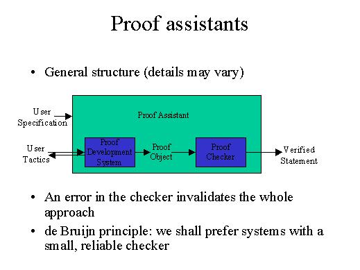 proof of the given specification. Of course it is not the assistant that gives us ingenuity, but it is the user that, by the use of tactics, tells the assistant how to build the actual proof. When the user thinks the proof is complete it closes the proof construction procedure and a proof object is produced. At this point the proof object is passed to the second module of the assistant which is a proof checker. If the proof is correct the specification is verified and validated. Of course the crucial point of this process is the proof checker. If there is an error in the proof checker, then the whole procedure is invalid. And so it is crucial to have proof checkers that could be in a sense trusted. And as de Bruijn - one of the pioneers of this approach to formal proof verification - said, we should prefer systems with a small reliable checker. So, here we a kind of trade-off. From one point of view we would like to have very strong logics, because strong logics allow to give better proofs and to prove them in a more concise way. On the other hand we need small proof checkers. And this apparently is a contradiction. |
