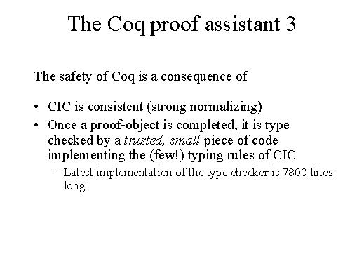 All the complexity of the proof of consistency is put into the theorem, which of course is not part of the proof checker. In this way, when we produce a proof object we may pass it to the proof checker, which in this case is just a type checker and it is represented by a trusted, very small piece of code implementing the few typing rules of the calculus of constructions. As a matter of fact, the latest implementations of the type checker are less than 8000 lines long. |