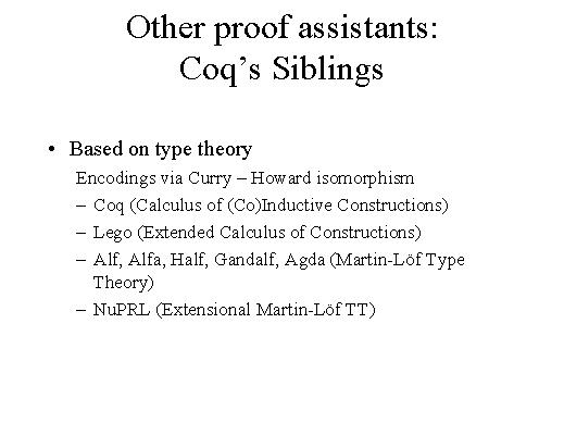 | There are other proof assistants based on type theory. We have Lego which is based on a different extension of the calculus of constructions; we have the family of proof assistants based on Martin-Löf type theory and developed essentially at Cornell University; we have the NuPRL proof assistant with is based on an extensional version of Martin-Löf type theory and developed at Cornell. |