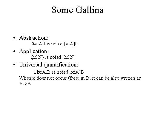 | Now let us look into the details of the Gallina language, in which we write terms and formulas. We have the l-calculus. Abstraction is denoted by square brackets, application is denoted in a trivial way, while universal quantification is denoted by the use of standard brackets. As usual, when x is not free in B the universal quantification can be seen as just a simple implication, and so it can be written as A®B. |