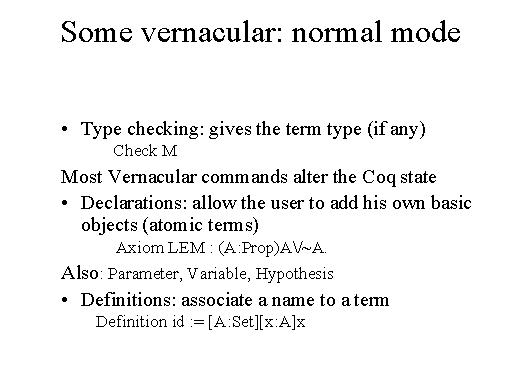 | Let's now look into the Vernacular. When we start the system the Vernacular is in normal mode. In normal mode we may issue a command to the system. For instance, we may ask to type check a term and obtain in this way the type of a given term. Most Vernacular commands alter the state. They are the commands required to save theorems, to extend the environment in which proofs are performed by adding declarations. For instance, in the slide we have added an axiom LEM for the law of excluded middle, which is the given formula. And in the same way we may add parameters, variables, hypotheses. Then we have definitions, where we may associate a name to a term. Let me remark the difference between an axiom and a definition: An axiom introduces a hypotheses - we are assuming the validity of a formula. The formula may be used during a proof by referring to its name. On the other hand, a definition is just a mere abbreviation: id is simply a shorthand for the longer term given in the slide. |