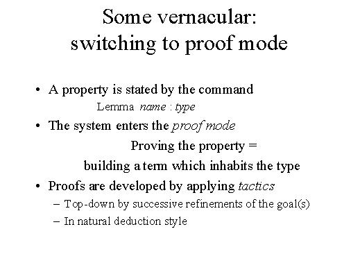 | At some point, in the Vernacular we will have to prove something. And then we state if we want to prove a theorem or a lemma, as it is done in the slides. We want to prove a lemma of a given name; the content of the lemma - what has to be proved - is the type. Now the system enters into proof mode. Proving the property means to build a term of the given type. Proofs are developed by applying tactics, by top-down refinements of goals that are presented by the system. But of course the tactics are given by the user who has to use his ingenuity in order to prove the theorem. The style in which the proofs are constructed is natural deduction. |
