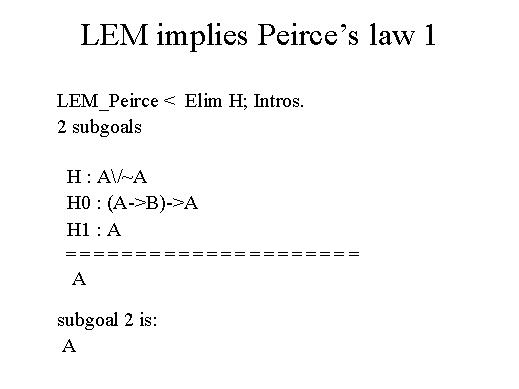 | At this point we want to prove A from A or ~A. And we go by cases on A. In the first line we say we want to use the elimination rule on "or", and then proceed by cases on the disjunction. The rest if the reply of Coq: We get two sub-goals. The first sub-goal is A, assuming A. The second sub-goal will still be A, to be proved by assuming not A. We tackle first the first sub-goal: We have to establish A, having A in the assumptions. So, this is trivial and this is what is said in the following slide: by using assumption, I immediately close the goal, and so I remain with just one sub-goal left, which is to prove A by assuming not A. |